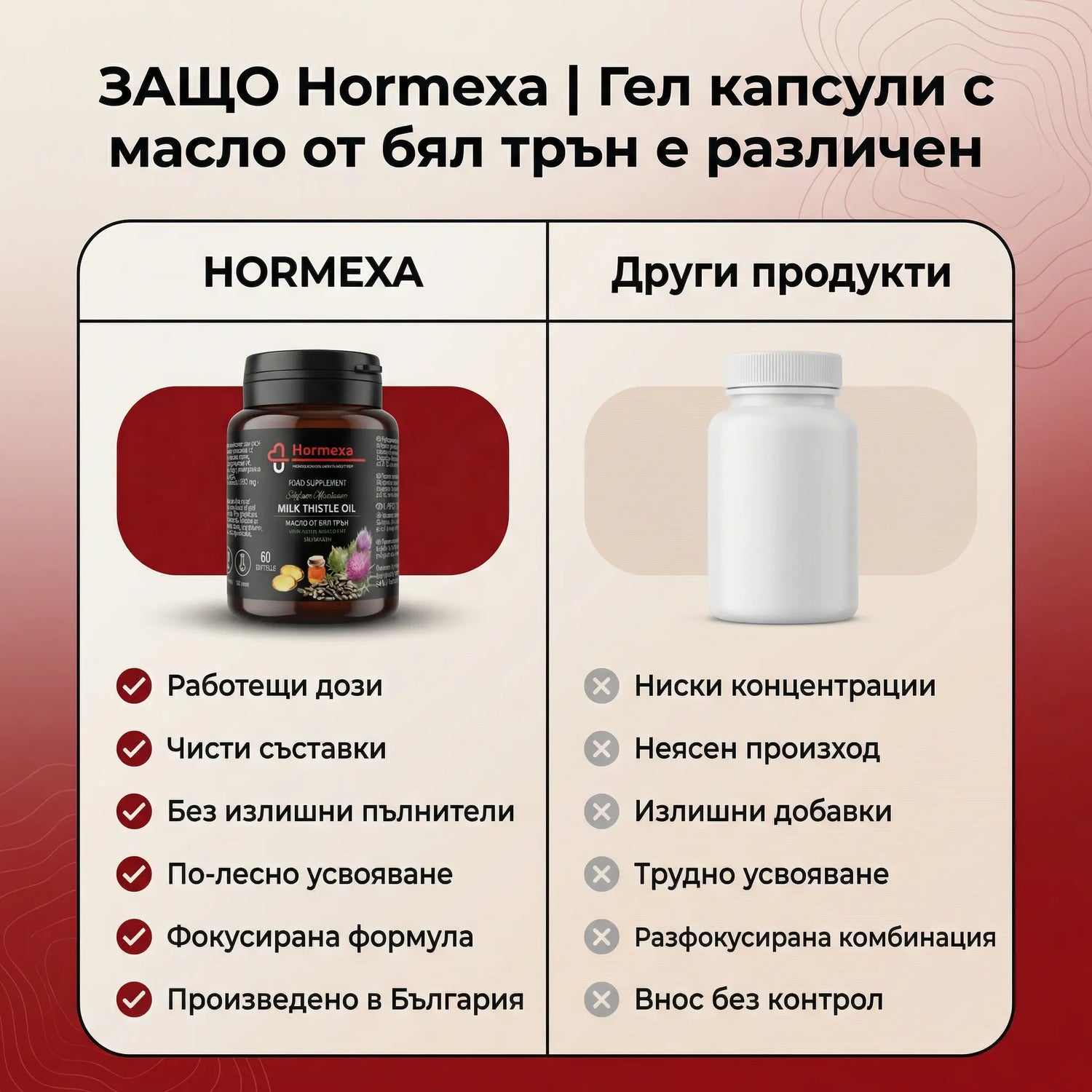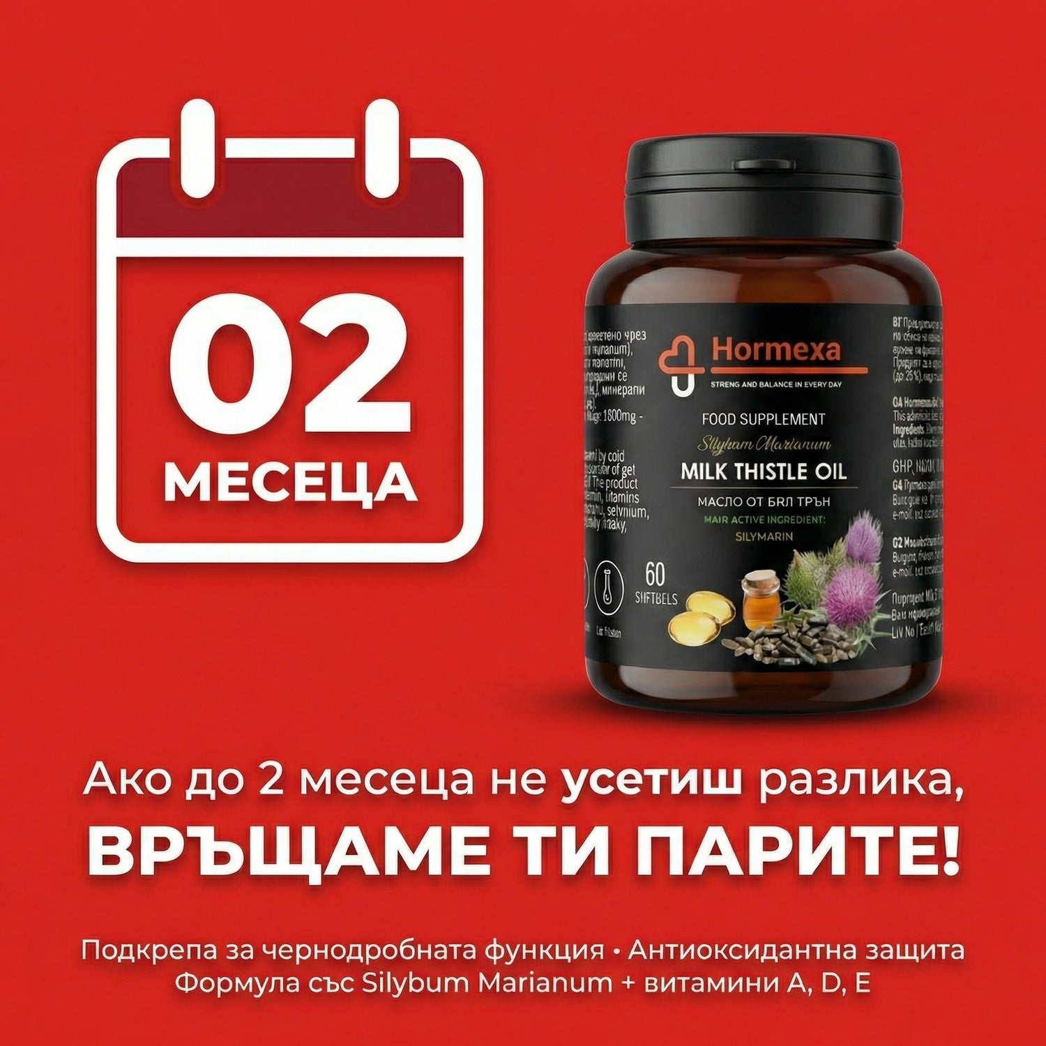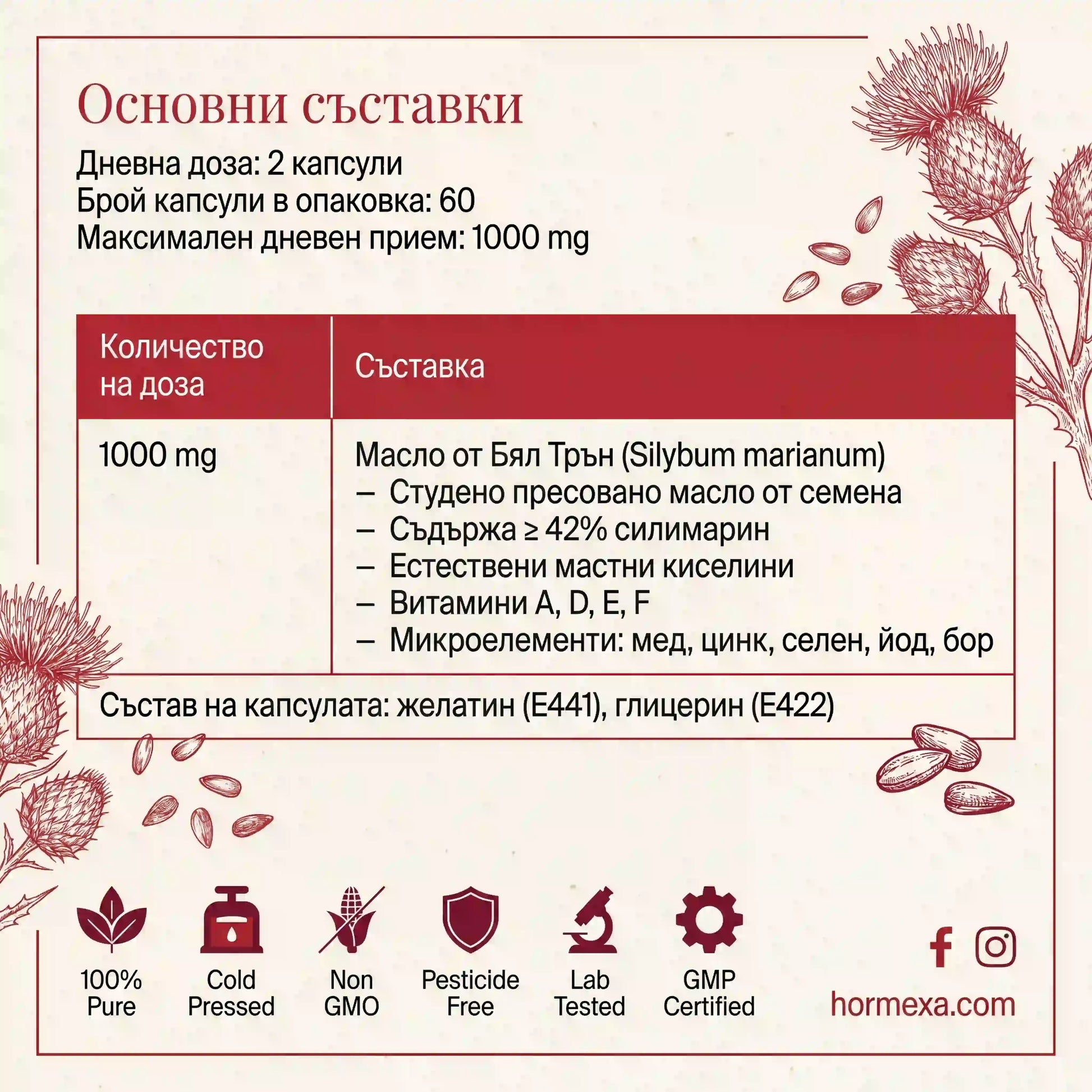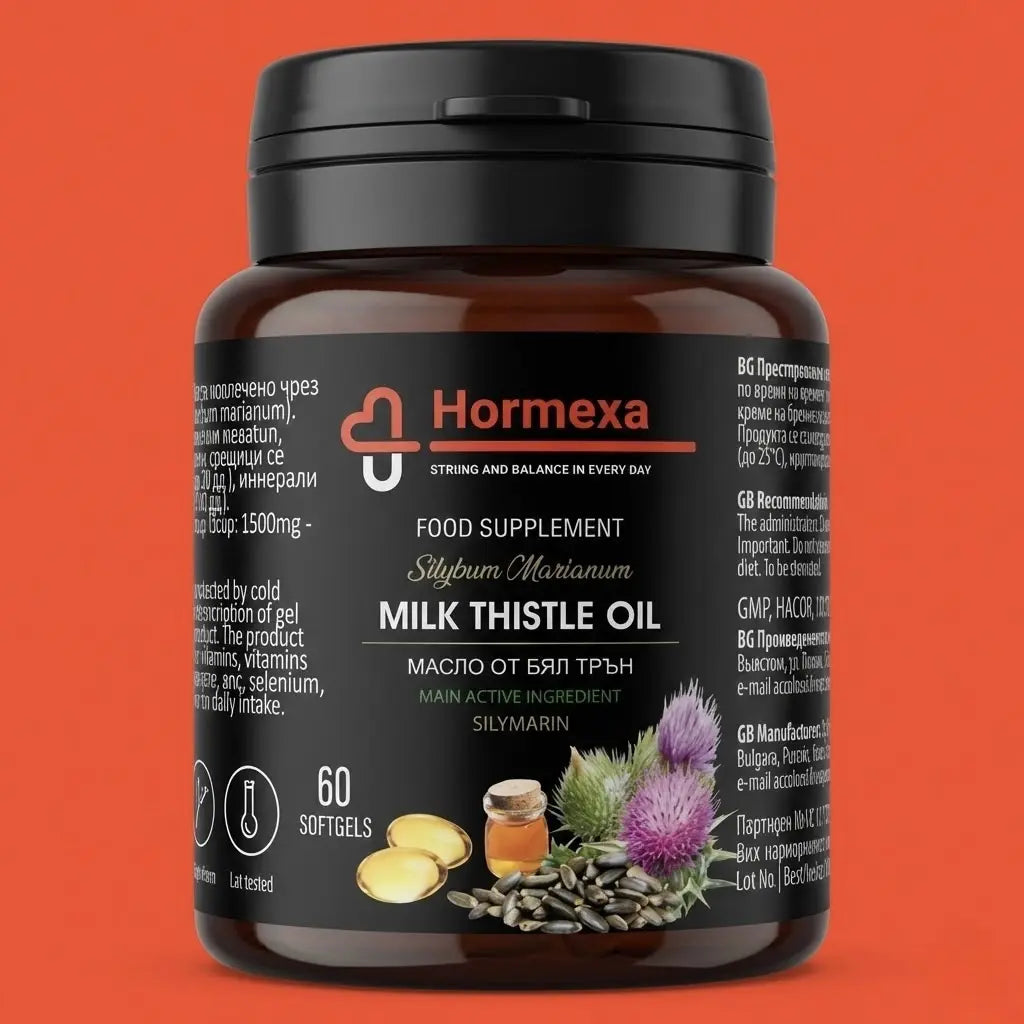 Гел капсули с масло от бял трън от Hormexa е разработен, за да подпомогне естественото пречистване на организма и нормалната чернодробна функция. Формулата със Silybum Marianum и витамини A, D и E допринася за антиоксидантна защита и по-добър вътрешен баланс.